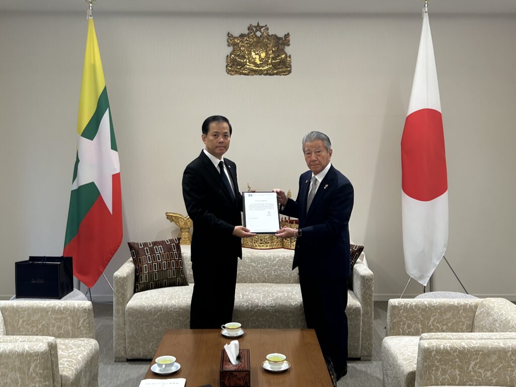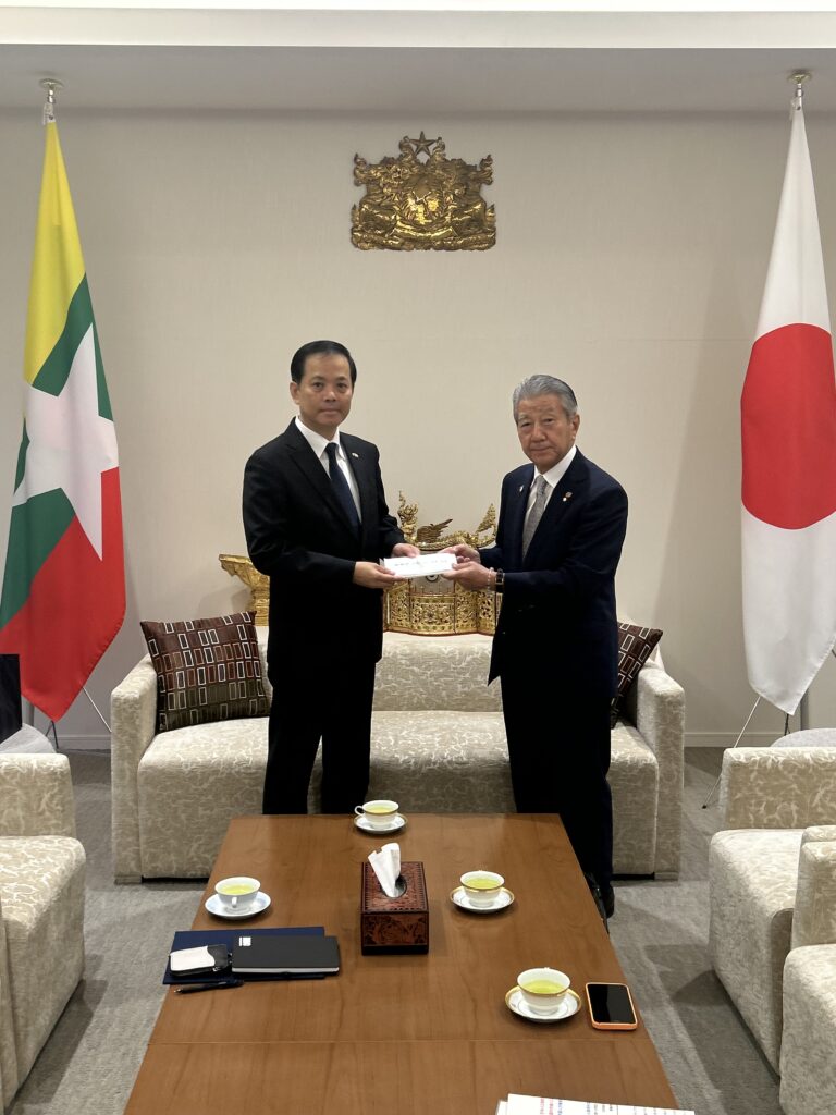 ミャンマー連邦共和国大地震災害復旧のため、大使館に寄付金をお渡しいたしました 名誉領事 2025年08月01日 8月1日(金)在名古屋ミャンマー連邦共和国名誉領事が、ミャンマー連邦共和国在日大使にミャンマーの大地震災害の復旧のため、寄付金をお渡ししました。 大使からは名誉領事に感謝状が贈られました。 ミャンマー大震災により被災された皆様へ ငလျင်ဘေးဒဏ်သင့်ပြည်သူများသို့ 復興支援コンサートのお知らせ